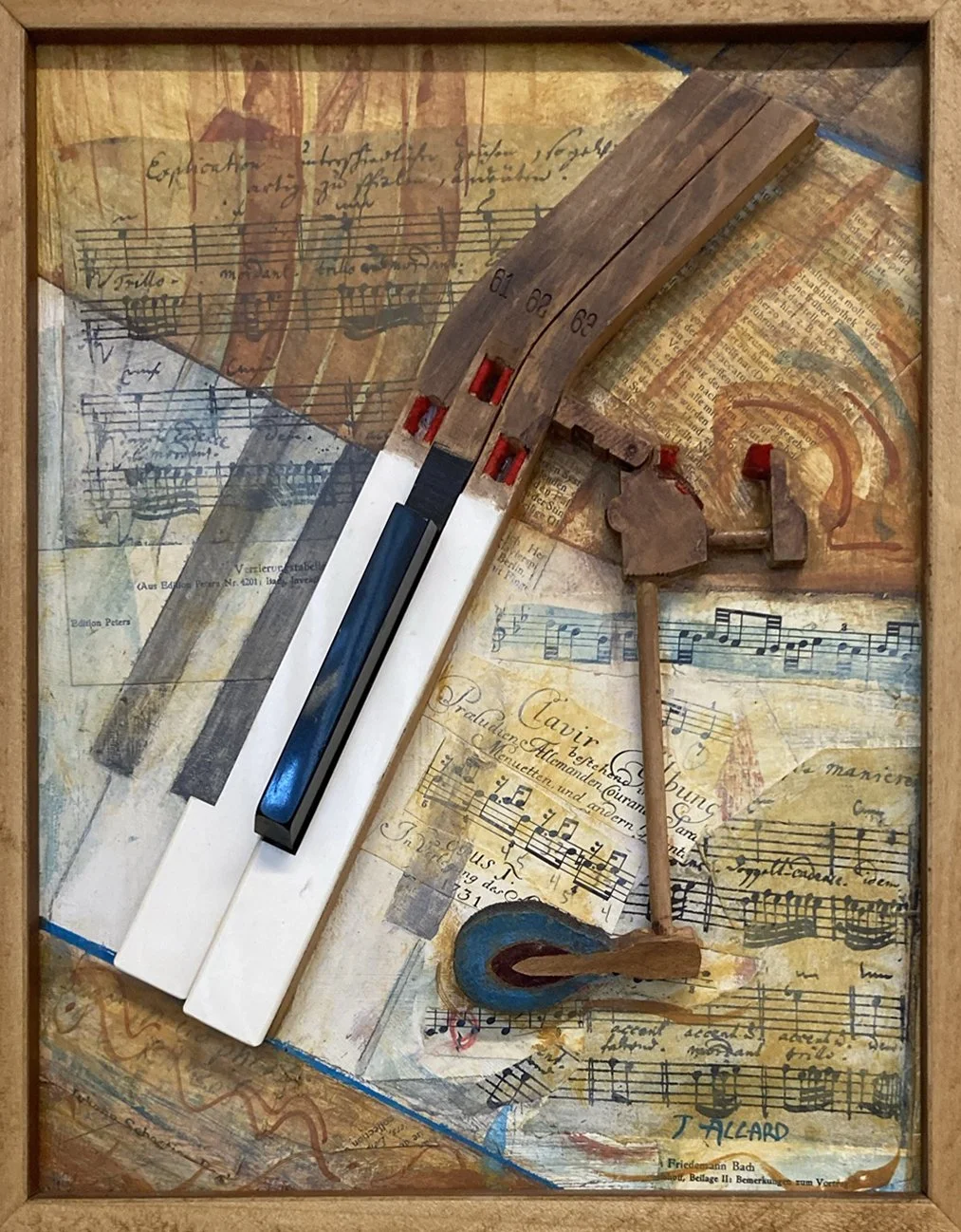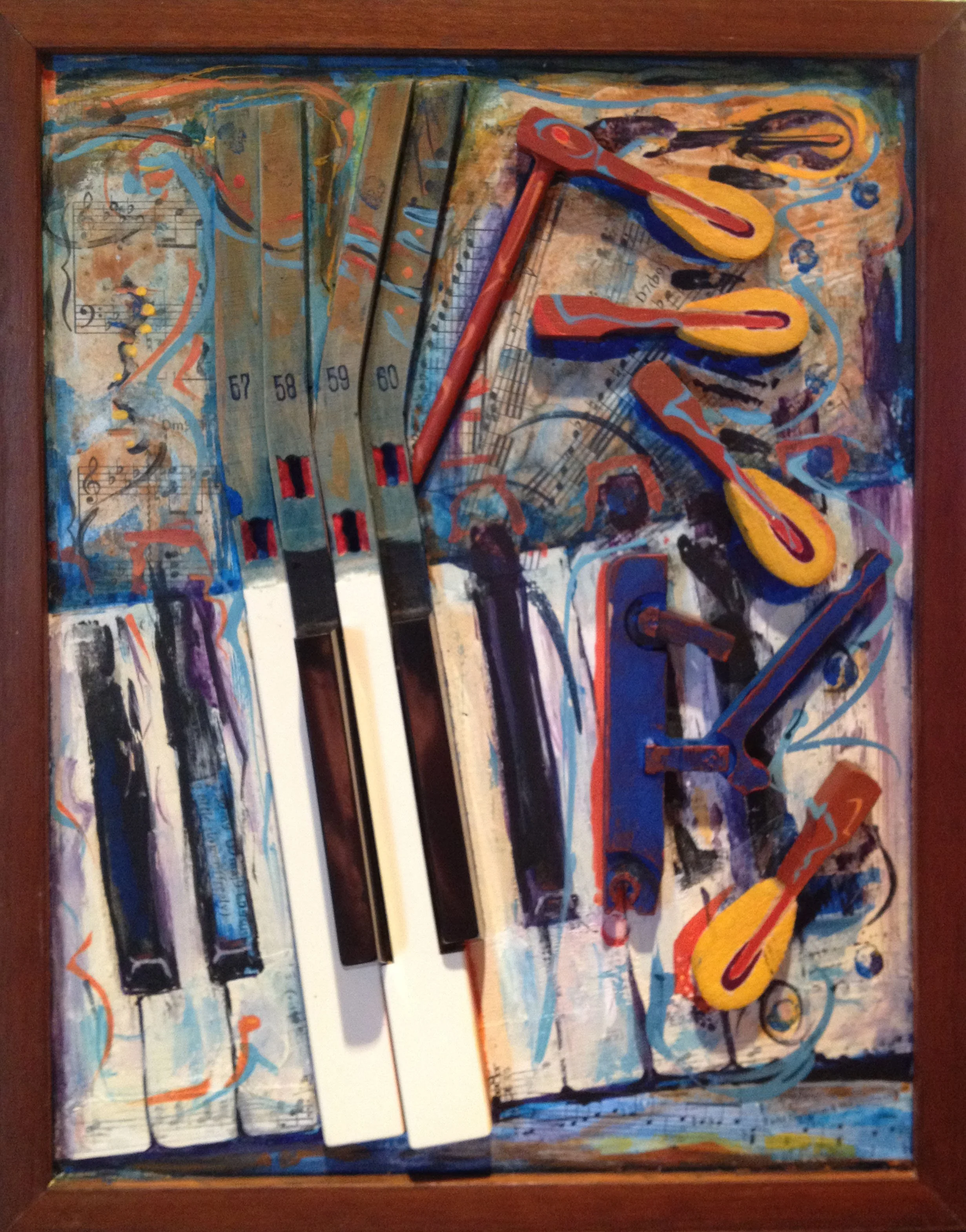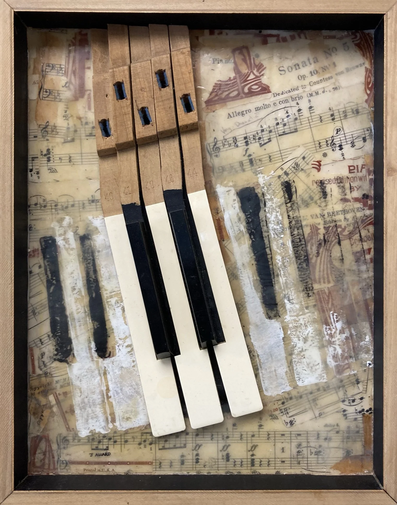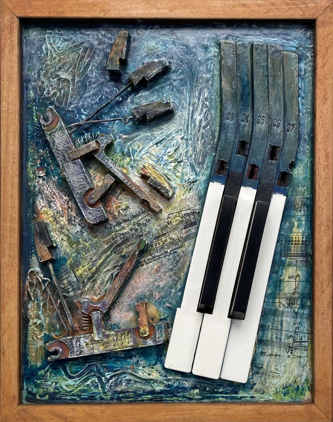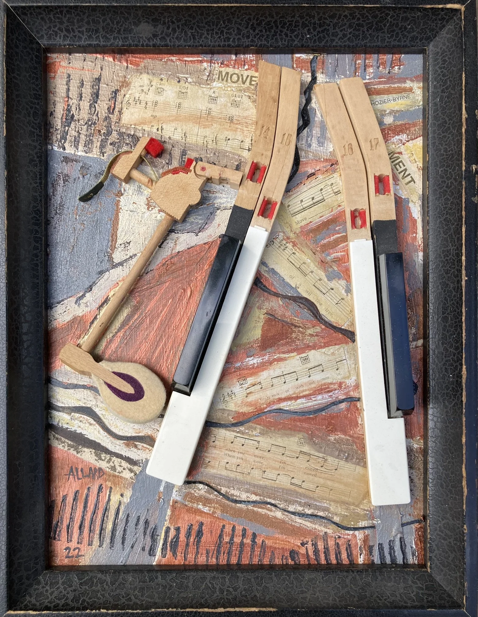 As both a piano teacher and an artist, I became interested in using recycled piano parts in 2008. It started when my friend Charlie, a piano tuner, gave me three piano keys, a piano hammer, and a Steinway pin. That gave me the idea to create a piano collage and I called it “Charlie’s Tune.” Soon after, I acquired a damaged upright Baldwin piano from New Orleans that endured Hurricane Katrina in 2005. I completely disassembled the piano, reassembling the parts into these collages. I selected keys, hammers, various appurtenances and painted in a whimsical fashion on a Masonite board to create a musical piece of art. In most cases, the piano cabinetry is used to make the art frames. I use sheet music from any era or style which gives me creative ideas for the piano keys and parts. When working on these, I am reminded of all the craftsmen who constructed the 12,000 parts of the piano and the fingers that made the music.