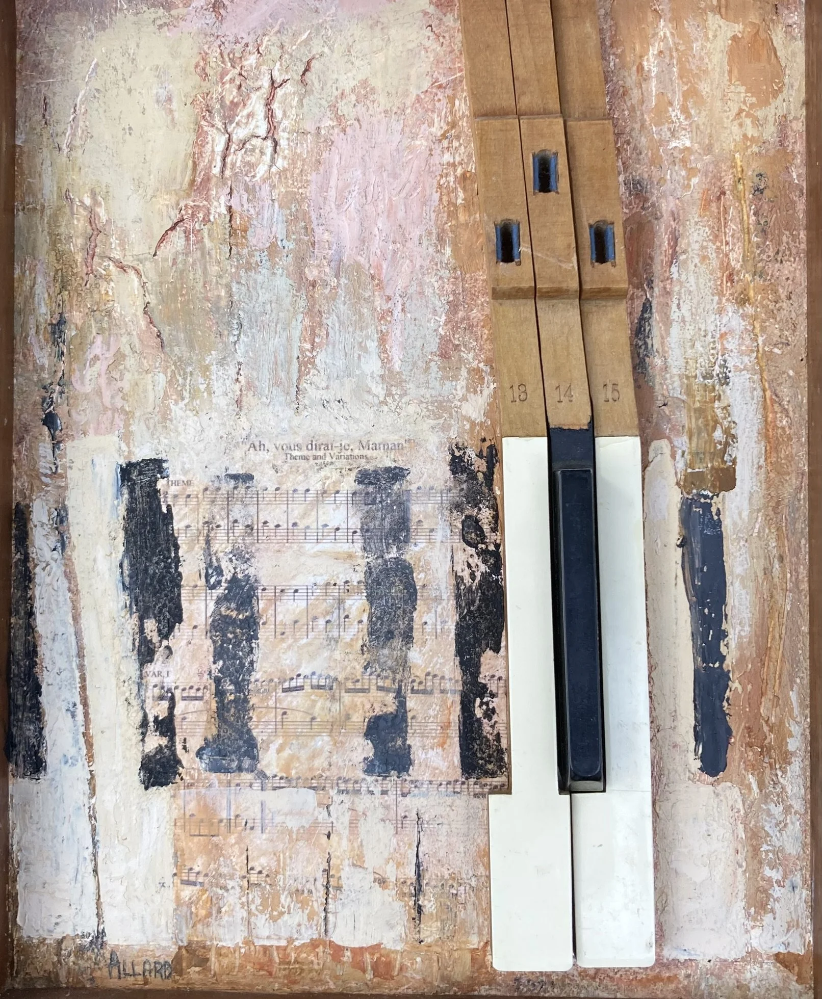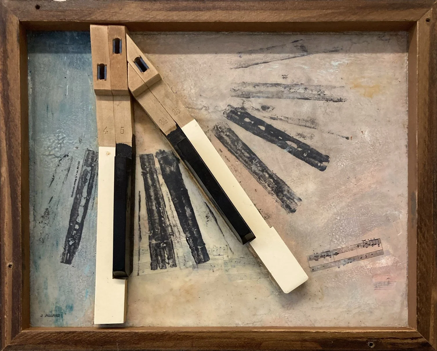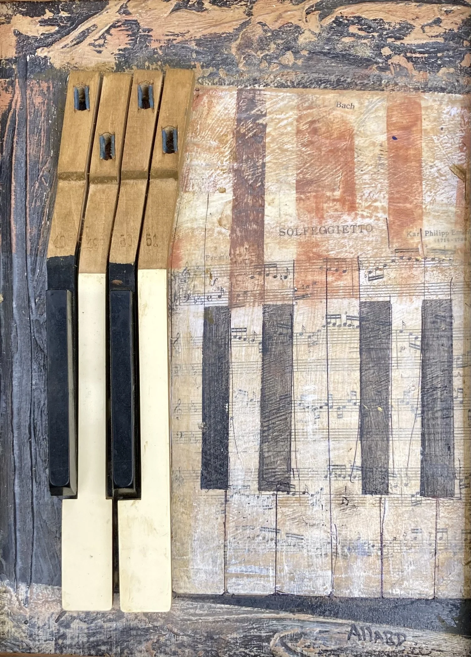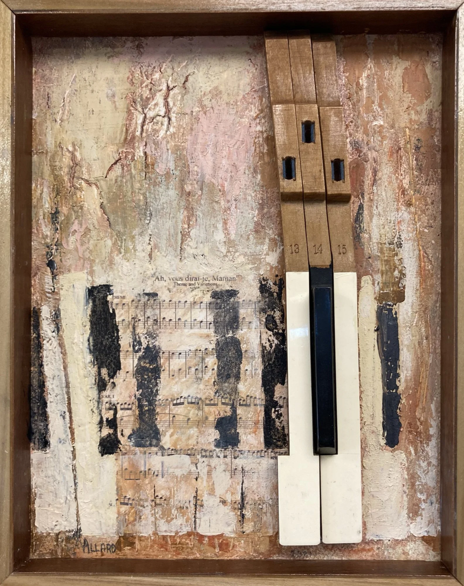 As both a piano teacher and an artist, I became interested in using recycled piano parts in 2008. It started when my friend Charlie, a piano tuner, gave me three piano keys, a piano hammer, and a Steinway pin. That gave me the idea to create a piano collage and I called it “Charlie’s Tune.” Soon after, I acquired a damaged upright Baldwin piano from New Orleans that endured Hurricane Katrina in 2005. I completely disassembled the piano, reassembling the parts into these collages. I selected keys, hammers, various appurtenances and painted in a whimsical fashion on a Masonite board to create a musical piece of art. In most cases, the piano cabinetry is used to make the art frames. I use sheet music from any era or style which gives me creative ideas for the piano keys and parts. When working on these, I am reminded of all the craftsmen who constructed the 12,000 parts of the piano and the fingers that made the music.