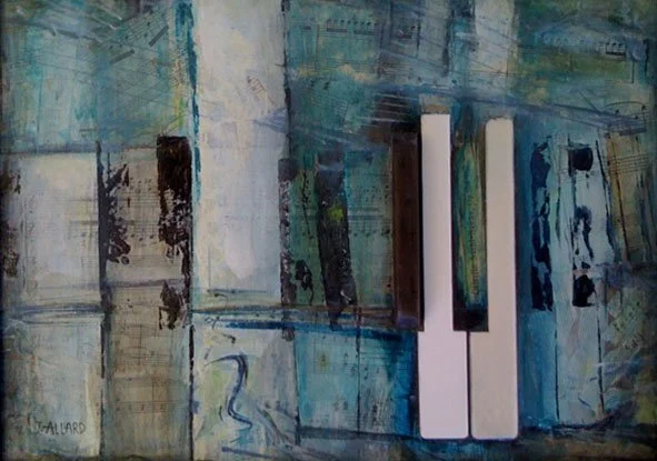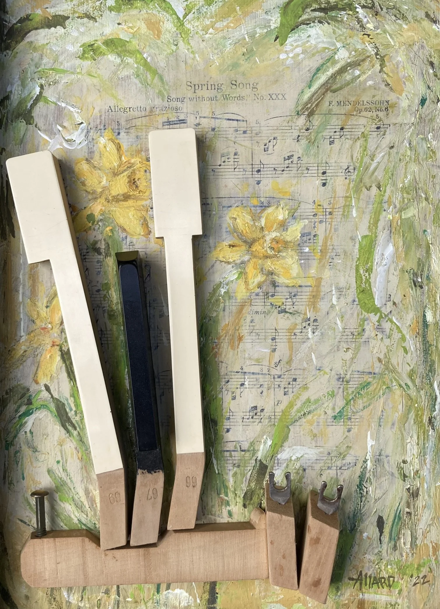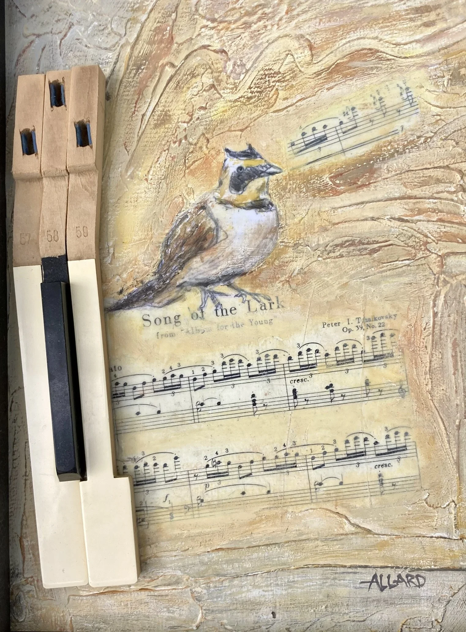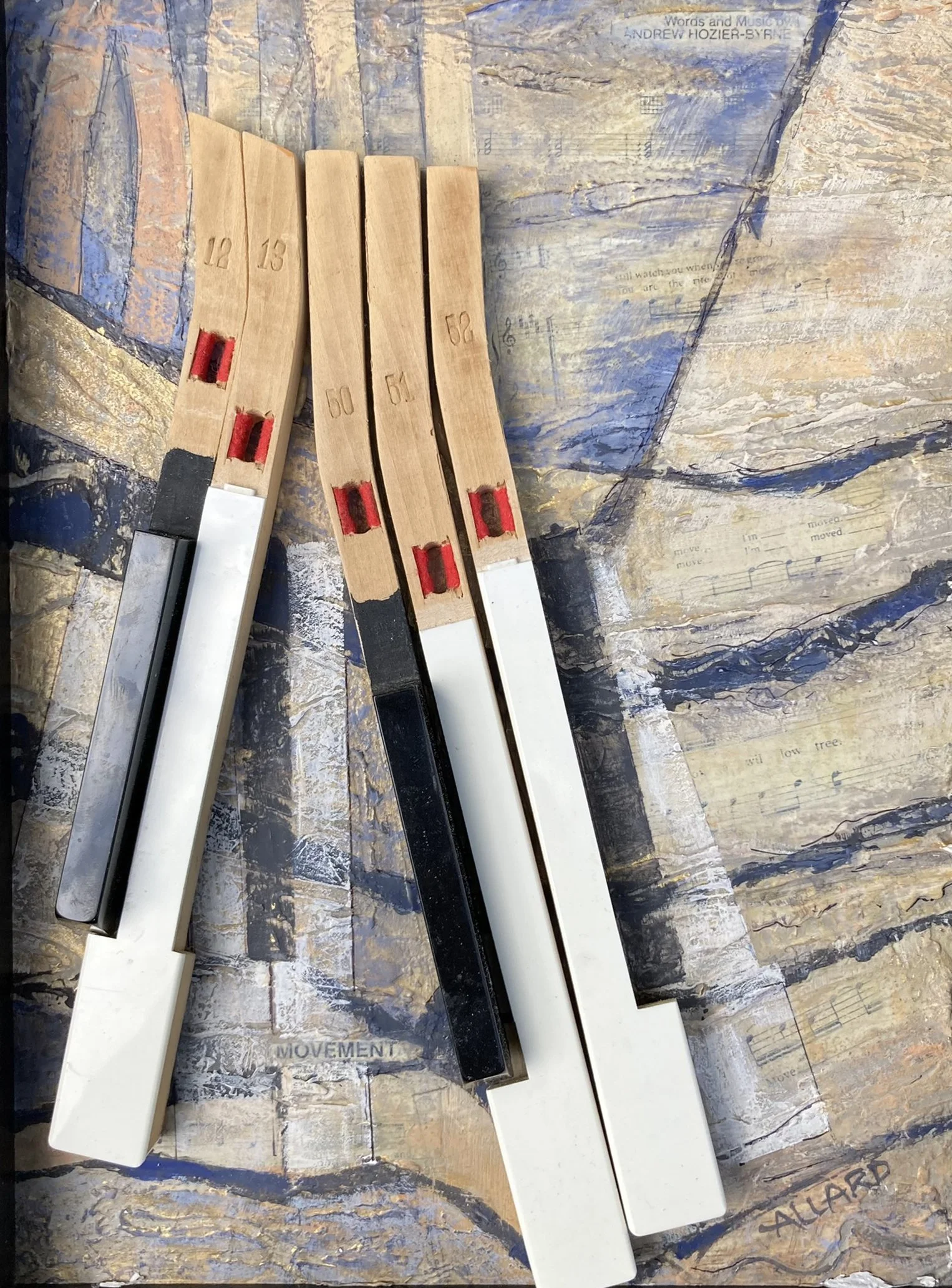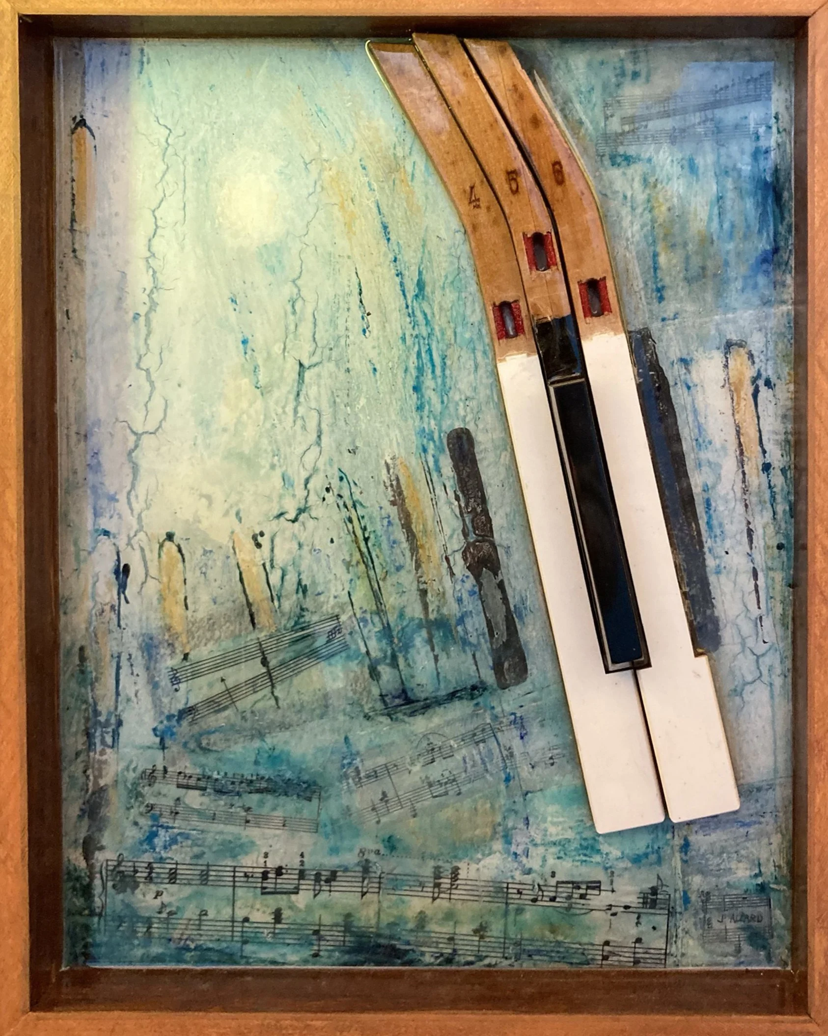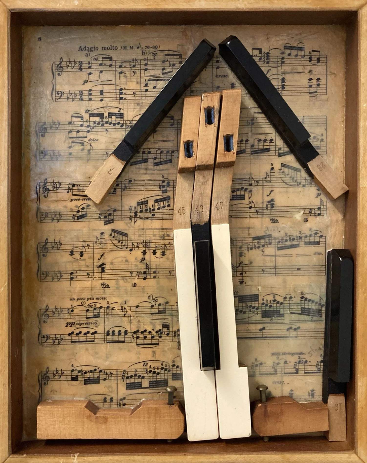 As both a piano teacher and an artist, I became interested in using recycled piano parts in 2008. It started when my friend Charlie, a piano tuner, gave me three piano keys, a piano hammer, and a Steinway pin. That gave me the idea to create a piano collage and I called it “Charlie’s Tune.” Soon after, I acquired a damaged upright Baldwin piano from New Orleans that endured Hurricane Katrina in 2005. I completely disassembled the piano, reassembling the parts into these collages. I selected keys, hammers, various appurtenances and painted in a whimsical fashion on a Masonite board to create a musical piece of art. In most cases, the piano cabinetry is used to make the art frames. I use sheet music from any era or style which gives me creative ideas for the piano keys and parts. When working on these, I am reminded of all the craftsmen who constructed the 12,000 parts of the piano and the fingers that made the music.