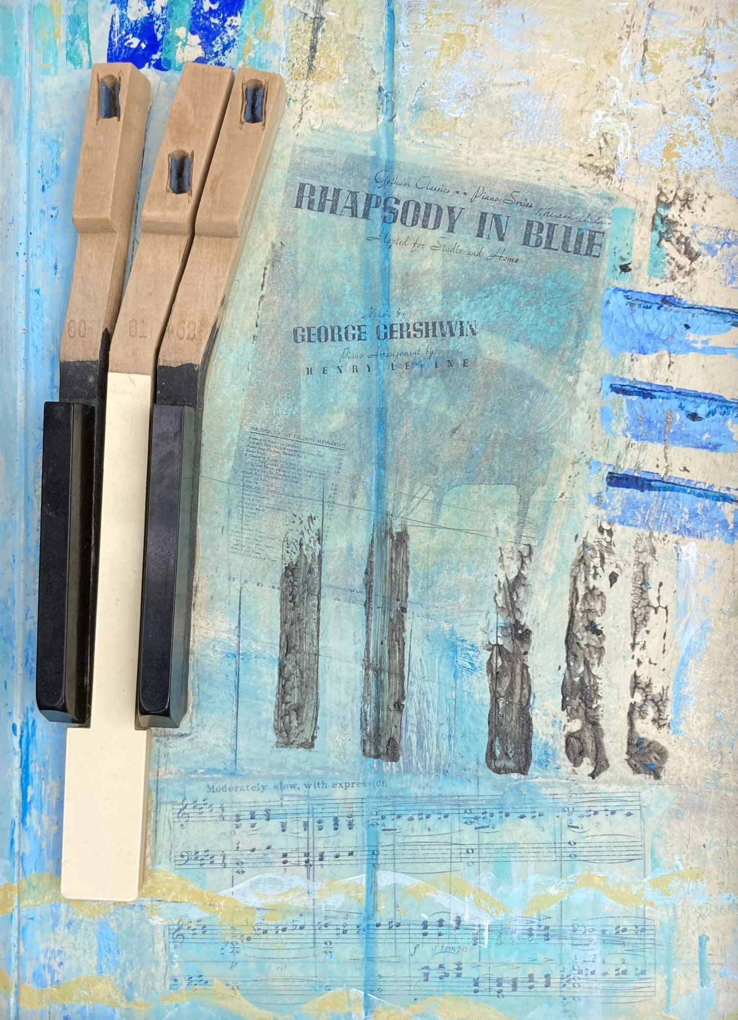 Blue Moon | 2019 | In 1961, The Marcel's cover of "Blue Moon" by Richard Rogers became an international number-one hit. | Baldwin upright piano keys on Masonite board, encaustic and acrylic medium, sheet music, poly resin, piano cabinetry