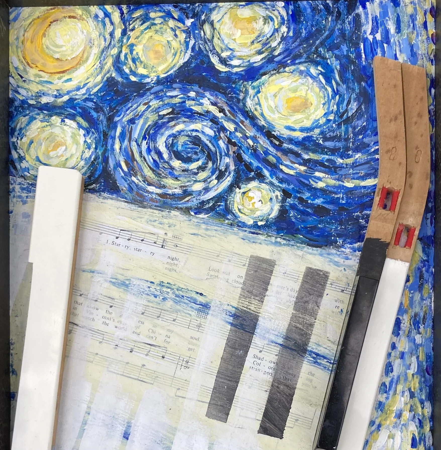 Music of the Starry Night | 2019 | George Crumb, a modern-classical composer known for his unusual timbres and notation. From his Macrokosmos III. | Baldwin upright piano keys on Masonite board, encaustic medium, sheet music, piano cabinetry