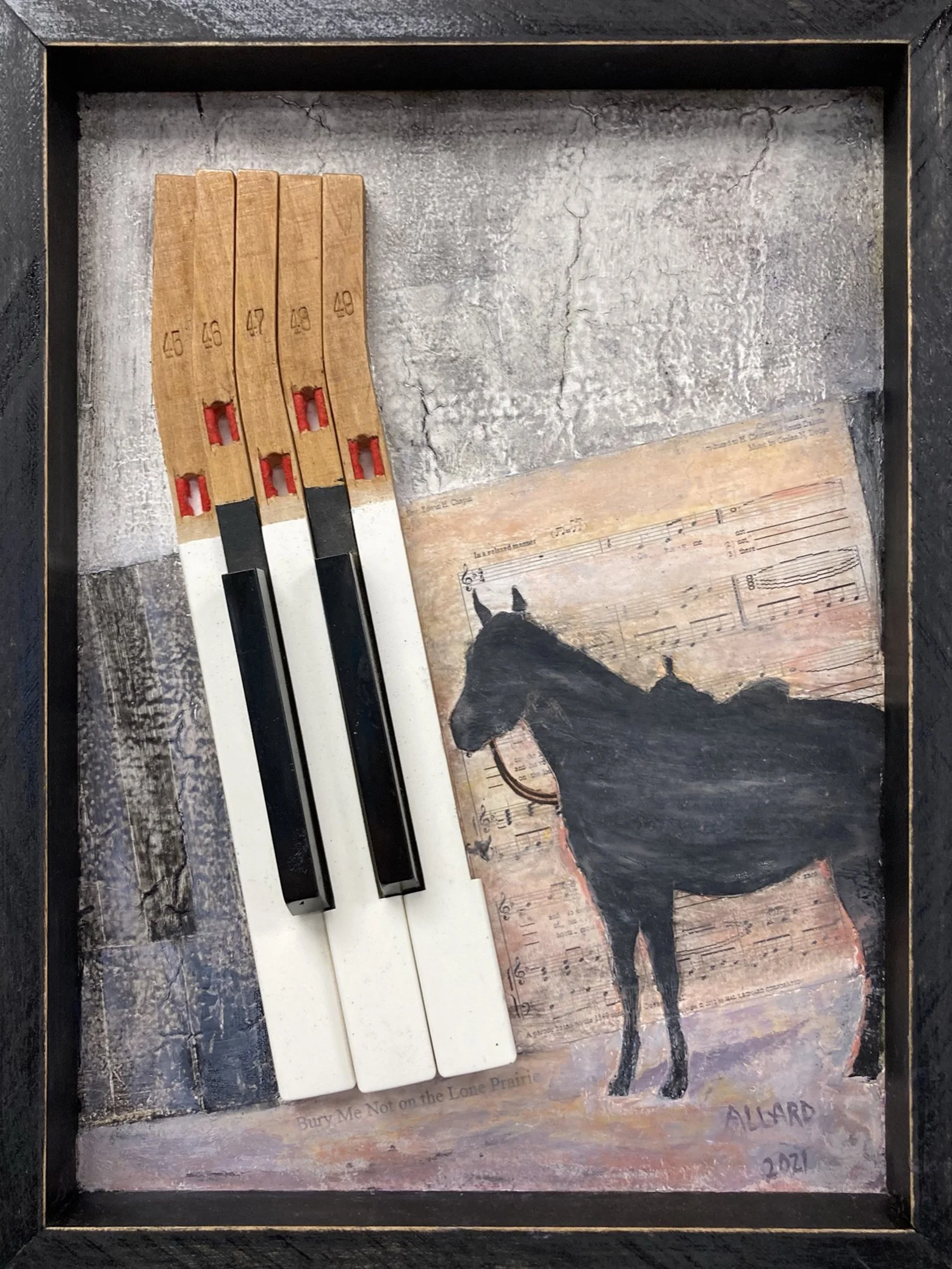 Bury Me Not on the Lone Prairie | 2021 | Music: Cowboy ballad folk song | Baldwin upright piano keys on Masonite board, cold wax and oil medium, sheet music, piano cabinetry